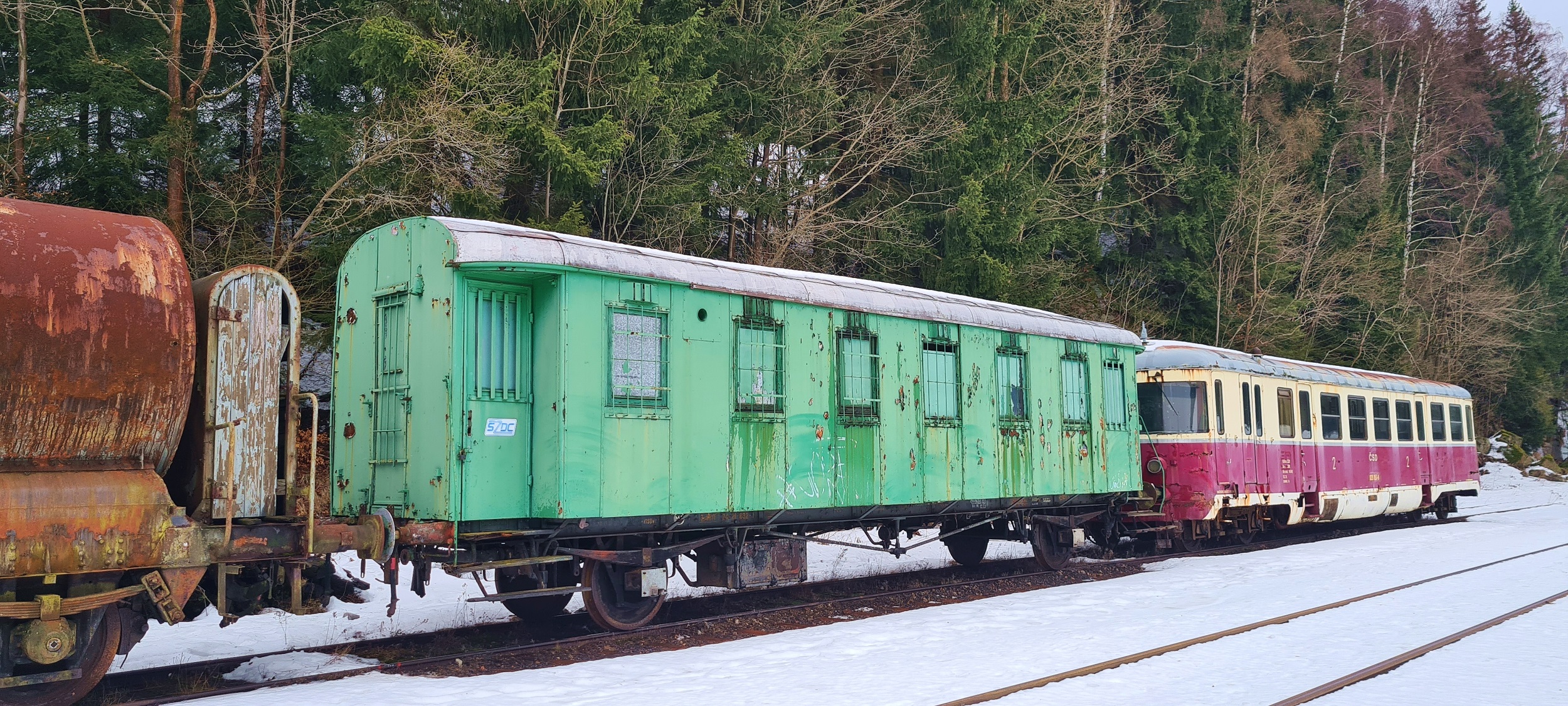 Wagon gospodarczy, wykonany na bazie wagonu pasażerkiego, nieznanej mi proweniencji. (Kořenov, 2026-02-05) |