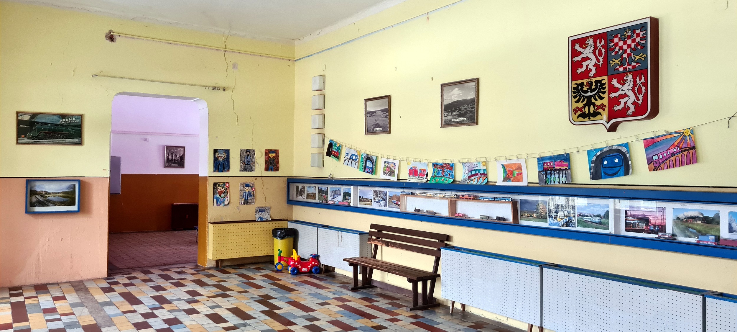 Ekspozycja prac plastycznych w holu dworca. (Kořenov, 2026-02-05) |