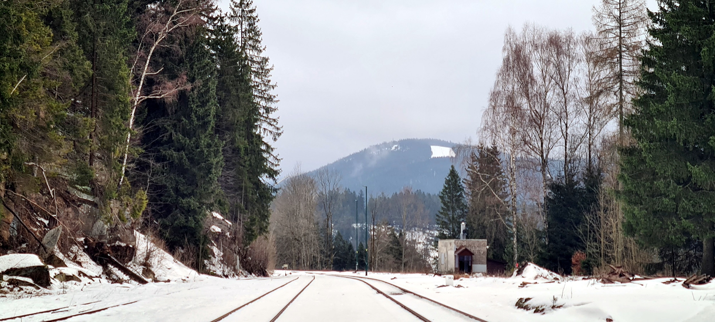 Wschodnia głowica rozjazdowa, widok w stronę Harrachova. (Kořenov, 2026-02-05) |