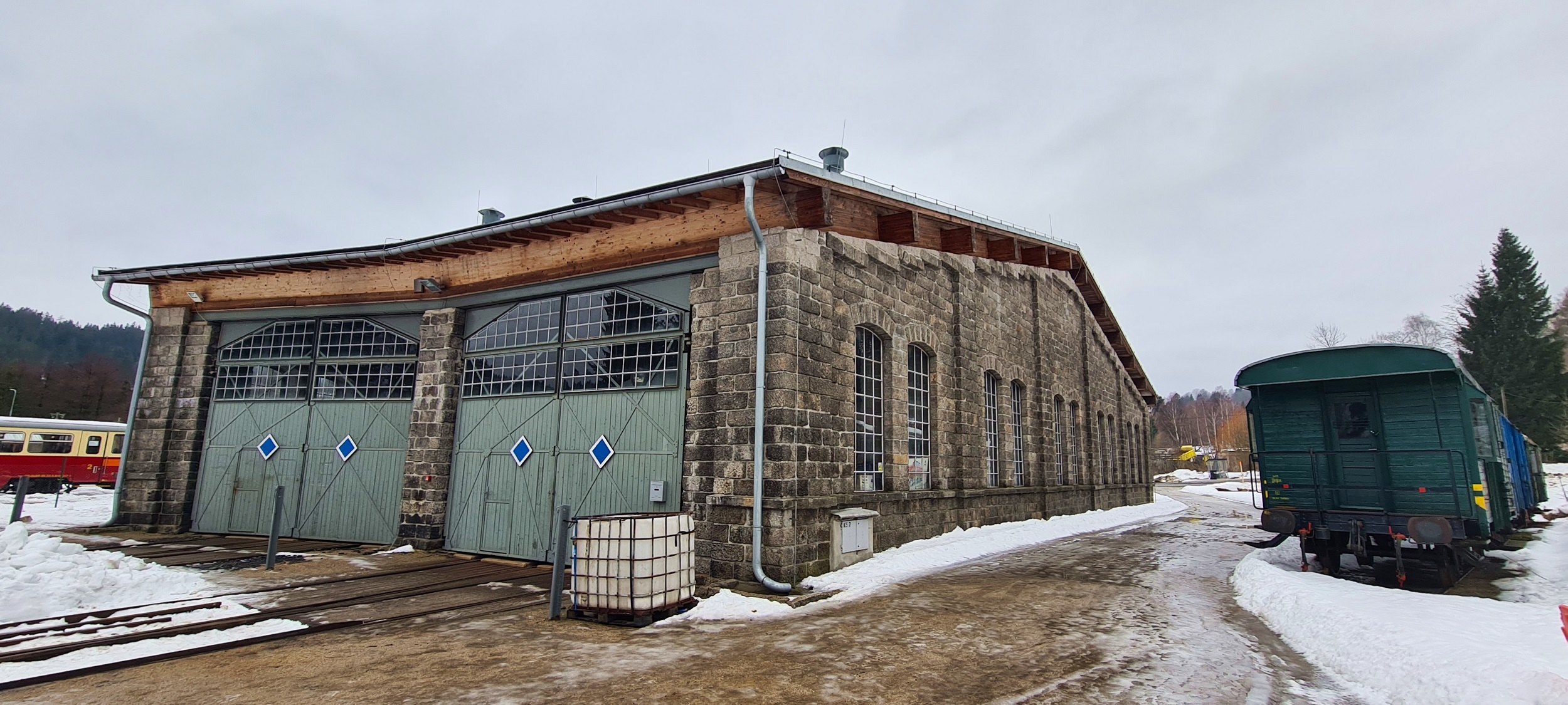 Hala wachlarzowa pełniła przez lata funkcję ciepłowni. W 2015 roku obiekt został odbudowany i przywrócony do pierwotnej funkcji, a właściwie jako część „Muzeum ozubnicové dráhy”, w której przechowywane są najcenniejsze egzemplarze taboru. (Kořenov, 2026-02-05) |