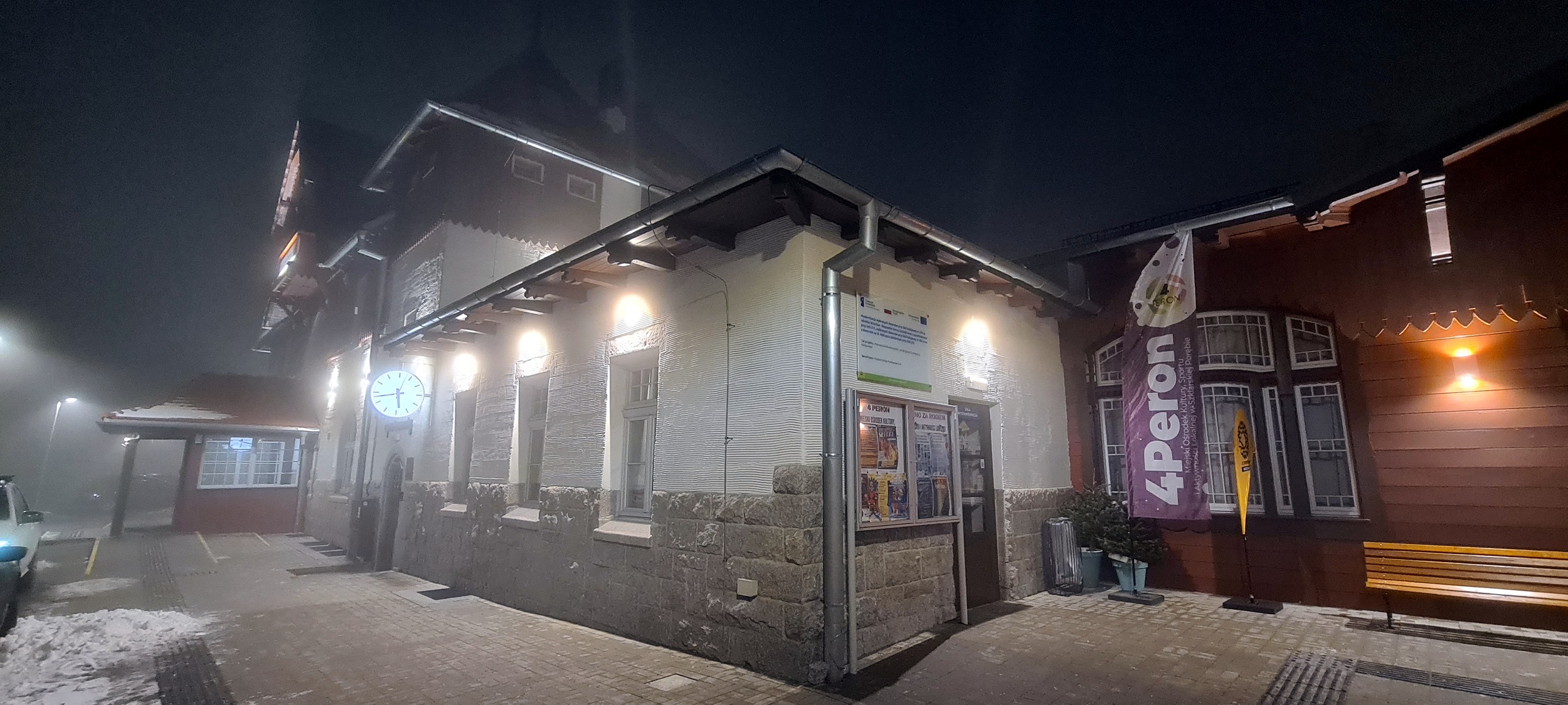 W budynku dworca, w głównym skrzydle, po prawej od wejścia do hali kasowej, mieszczą się pokoje gościnne pod szyldem Orient Express Apartamenty. (Szklarska Poręba Górna, 2026-02-04) |