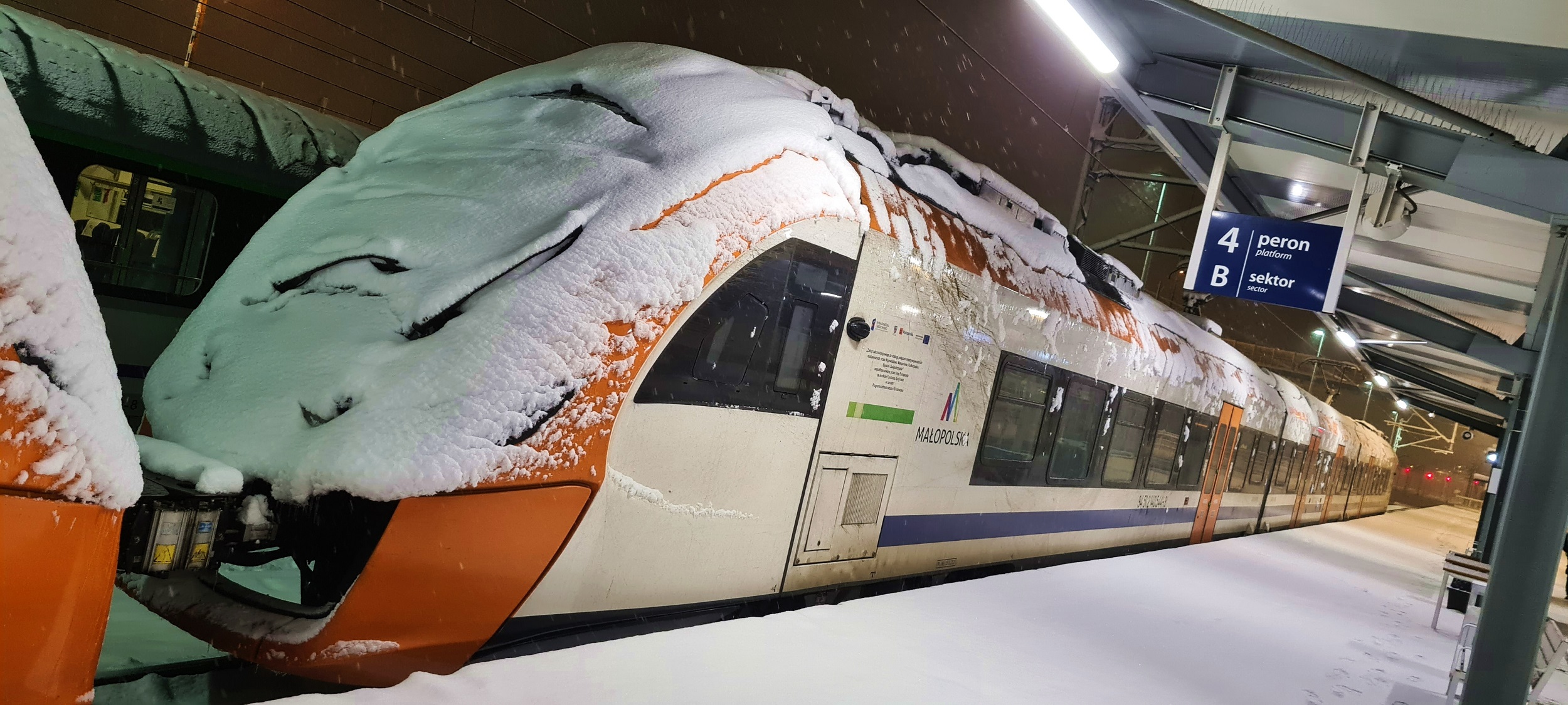 Zaśnieżony EN63A-018, jako pociąg R34302/3 do Katowic, w zestawie z EN63A-003. (Kraków Płaszów, 2026-02-15) |