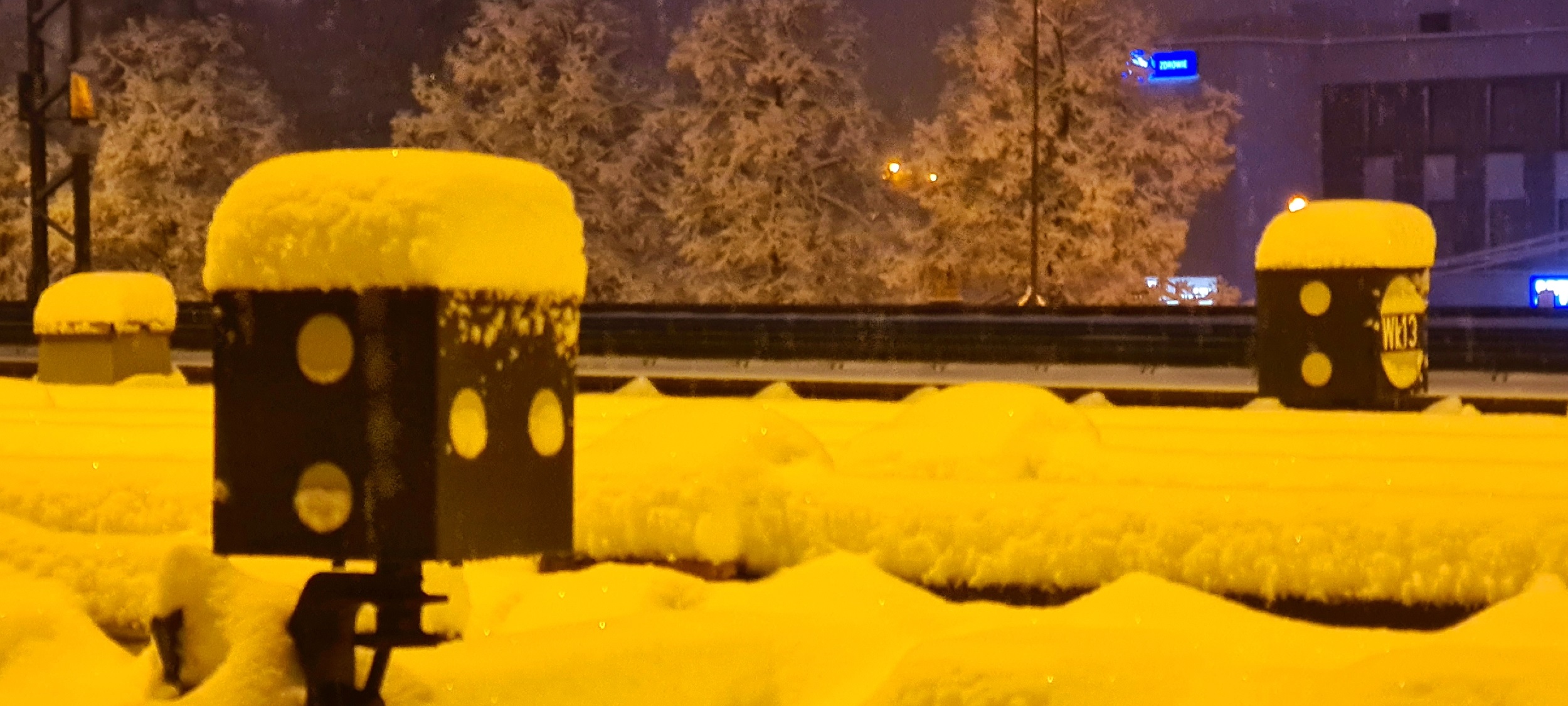 Zima nie odpuszcza już od ponad miesiąca. Latarnie wykolejnicowe na torze prowadzącym z ładowni, w świetle sodowym. (Kraków Łobzów, 2026-02-15) |