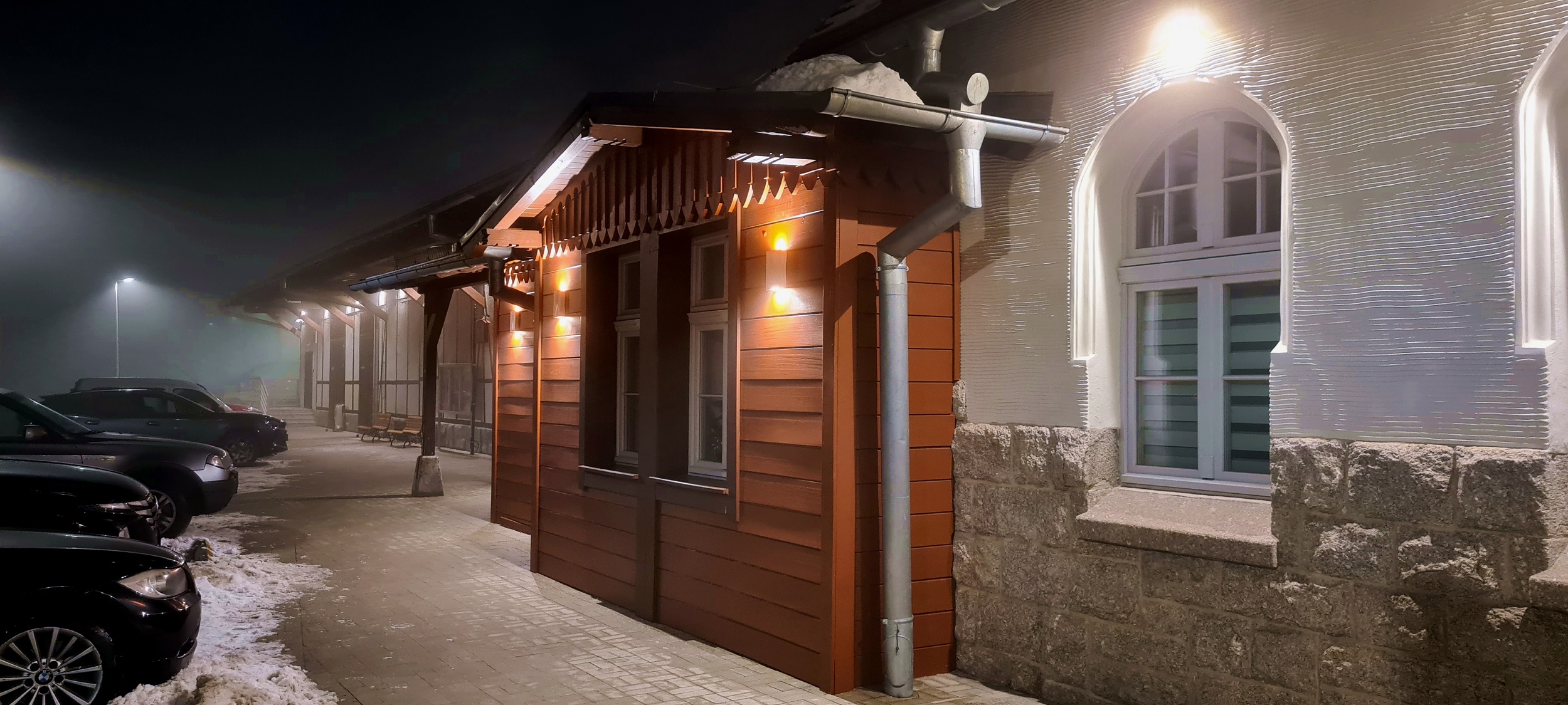 Drewniana dobudówka, będąca łącznikiem/wypełnieniem pomiędzy budynkiem dworca i magazynem. (Szklarska Poręba Górna, 2026-02-04) |