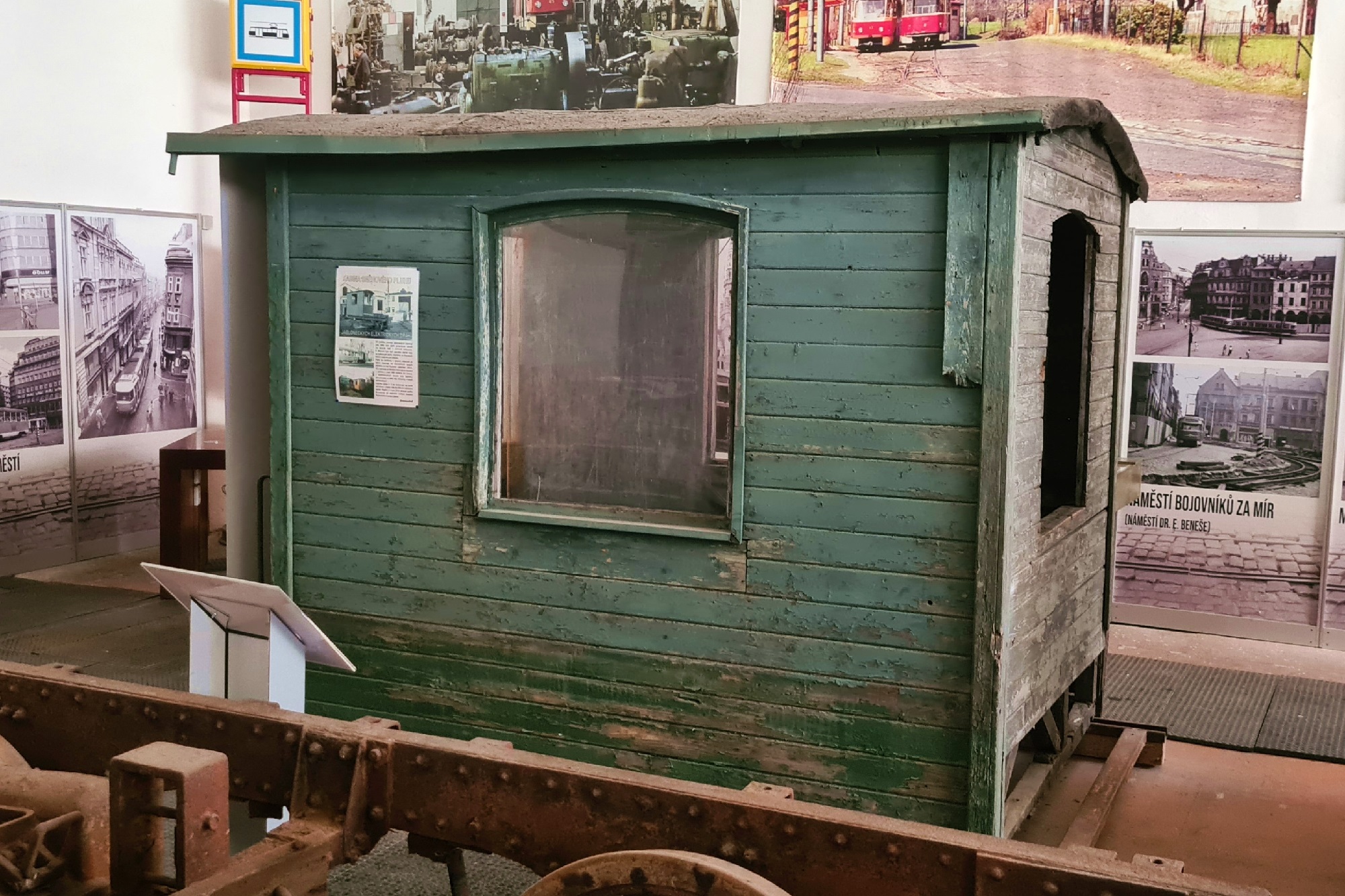 Kabina jabloneckiego pługu odśnieżnego. Był to wagon z lemieszem umieszczonym pod ostoją, pomiędzy zestawami kołowymi. Pług był rodzajem doczepy i odśnieżał ciągnięty za wozem silnikowym. (Liberec, 2026-02-04) |