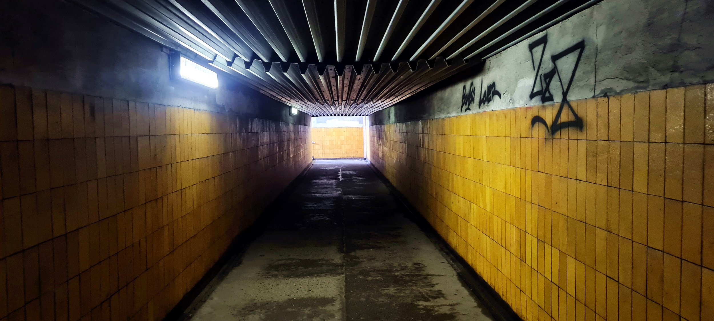 Stary tunel pod stacją. Widok w kierunku północnym, ujęcie z miejsca wyjścia na perony przez nastawnię dysponującą. (Katowice Zawodzie, 2026-02-22) |