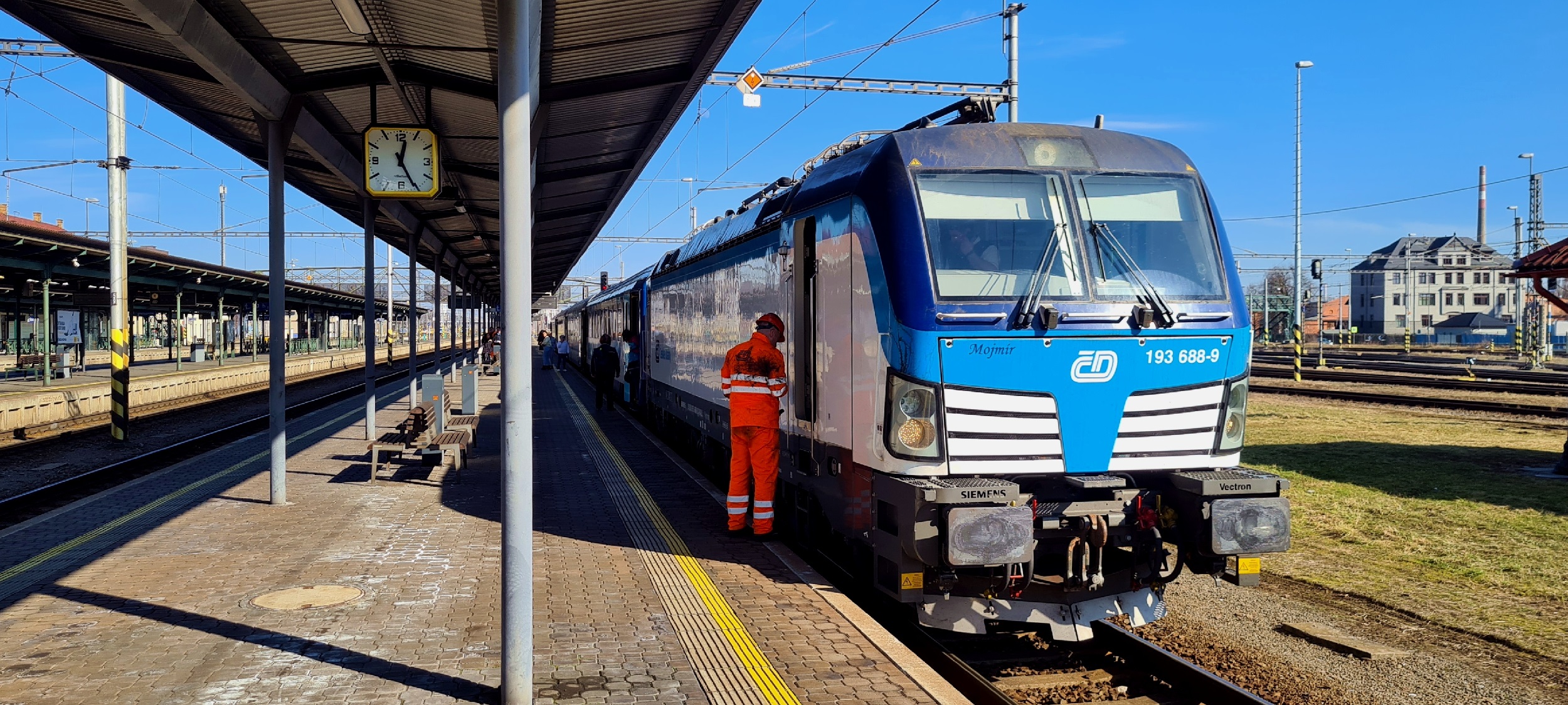 Mojmir na czele składu pociągu IC/EC205 „Prater”, relacji Kraków Główny – Wien Westbahnhof. Za lokomotywą znajduje się wagon bezpośredni relacji Kraków Główny – Budapest Nyugati, który zostanie za chwilę odłączony wraz z lokomotywą i poczeka na pociąg EC131 „Báthory”, relacji Warszawa Wschodnia – Budapest Nyugati. (Bohumín, 2026-02-26) |