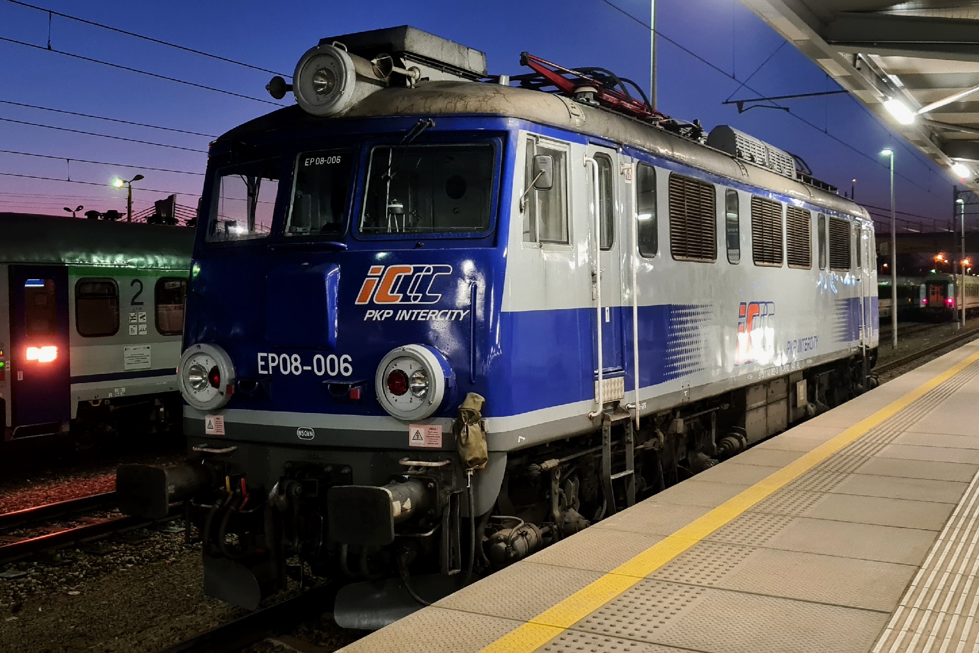 „Zimna” EP08-006 na torze przy peronie 4. (Kraków Płaszów, 2026-03-10) |