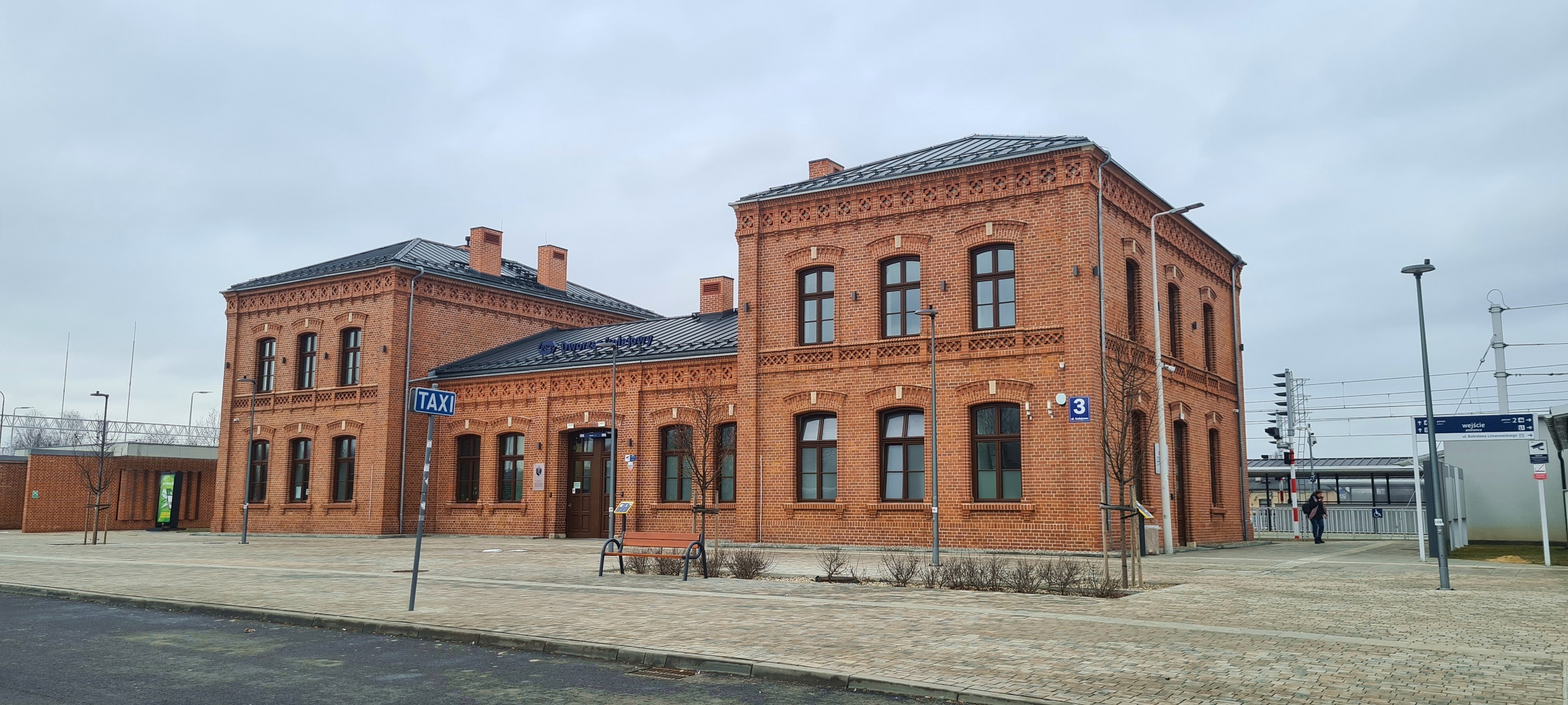 Odremontowany budynek dworca, ujęcie od południowego wschodu. (Dąbrowa Górnicza, 2026-02-22) |