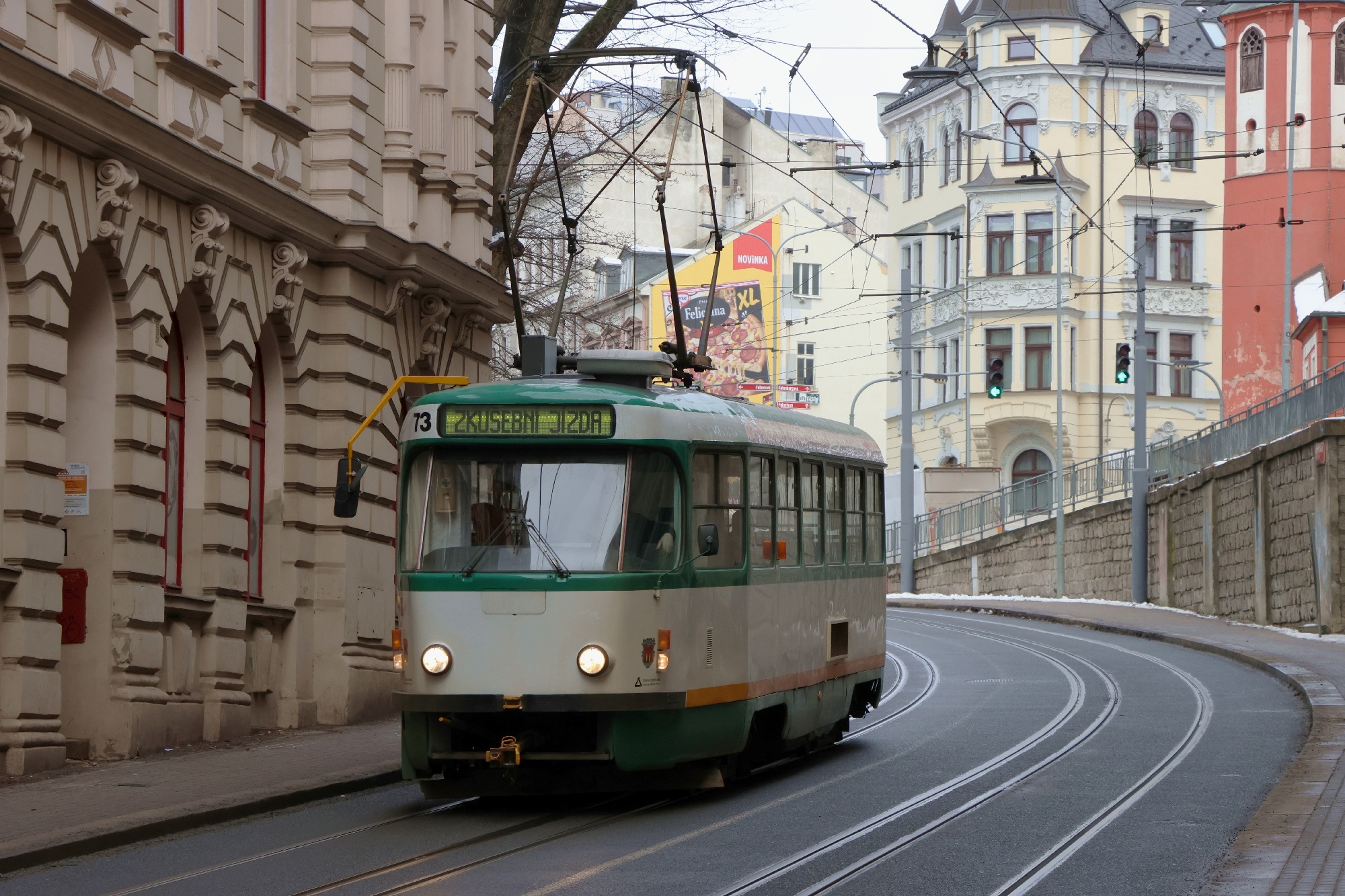 Ulica Rumunská. Tatra T3m #73 dolo jako „zkušební jízda” [jazda próbna]. (Liberec, 2026-02-04) |