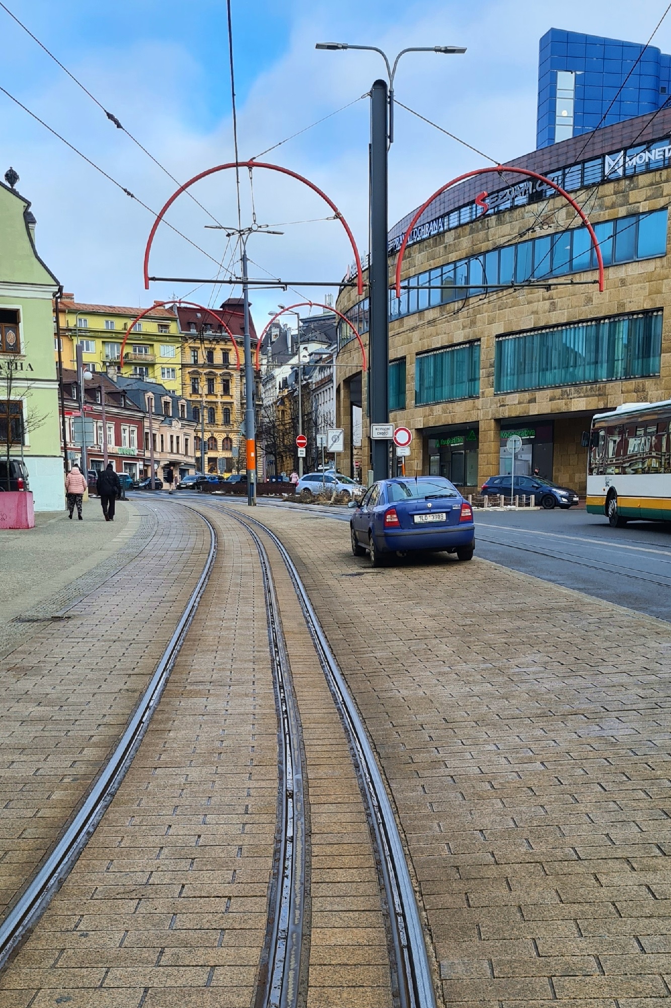 Trzyszynowy splot torowy w ulicy Fügnerovej. (Liberec, 2026-02-04) |