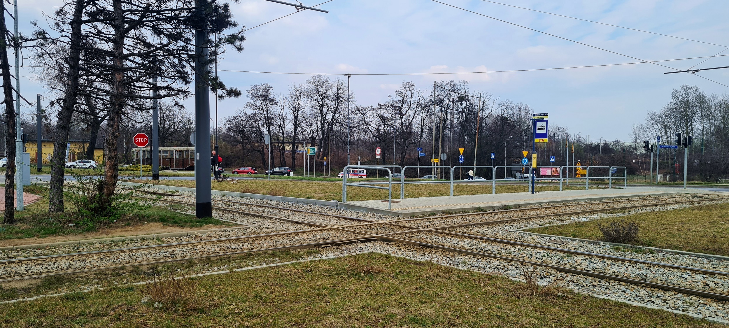 Skrzyżowanie po północnej stronie pętli. Z prawego, górnego narożnika kadru biegnie tor od strony Bytomia/Chorzowa. Z prawego, dolnego – wyjazd ku Zabrzu. (Ruda Śląska, Chebzie Pętla, 2026-03-24) |