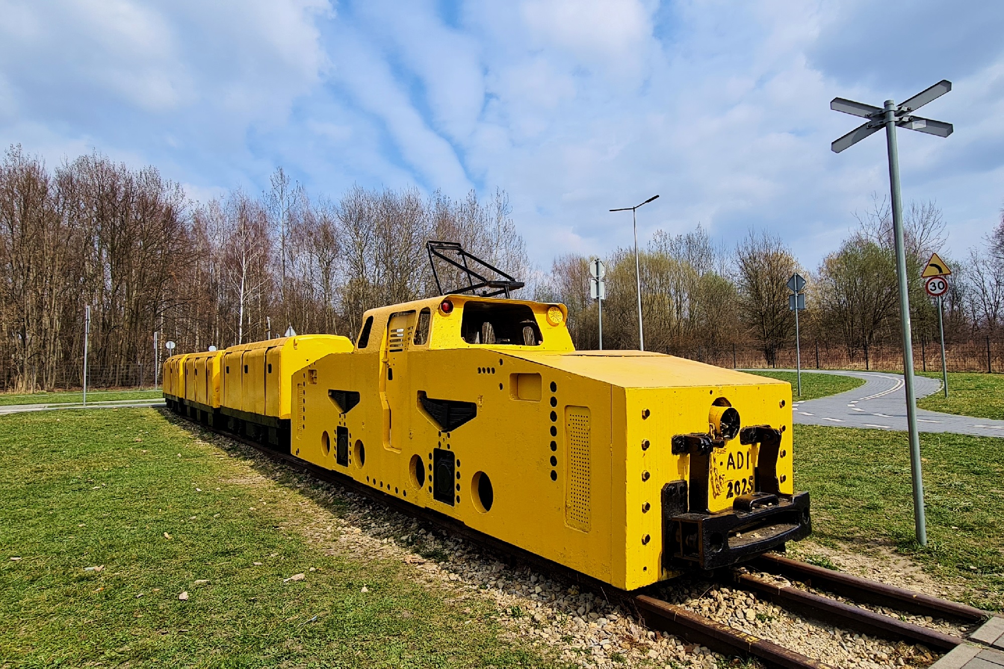 Lokomotywa dołowa Ld31 ze składem wozów kopalnianych do transportu pracowników, ustawiona na terenie miasteczka ruchu drogowego, przy ulicy Kolberga. (Ruda Śląska, 2026-03-24) |
