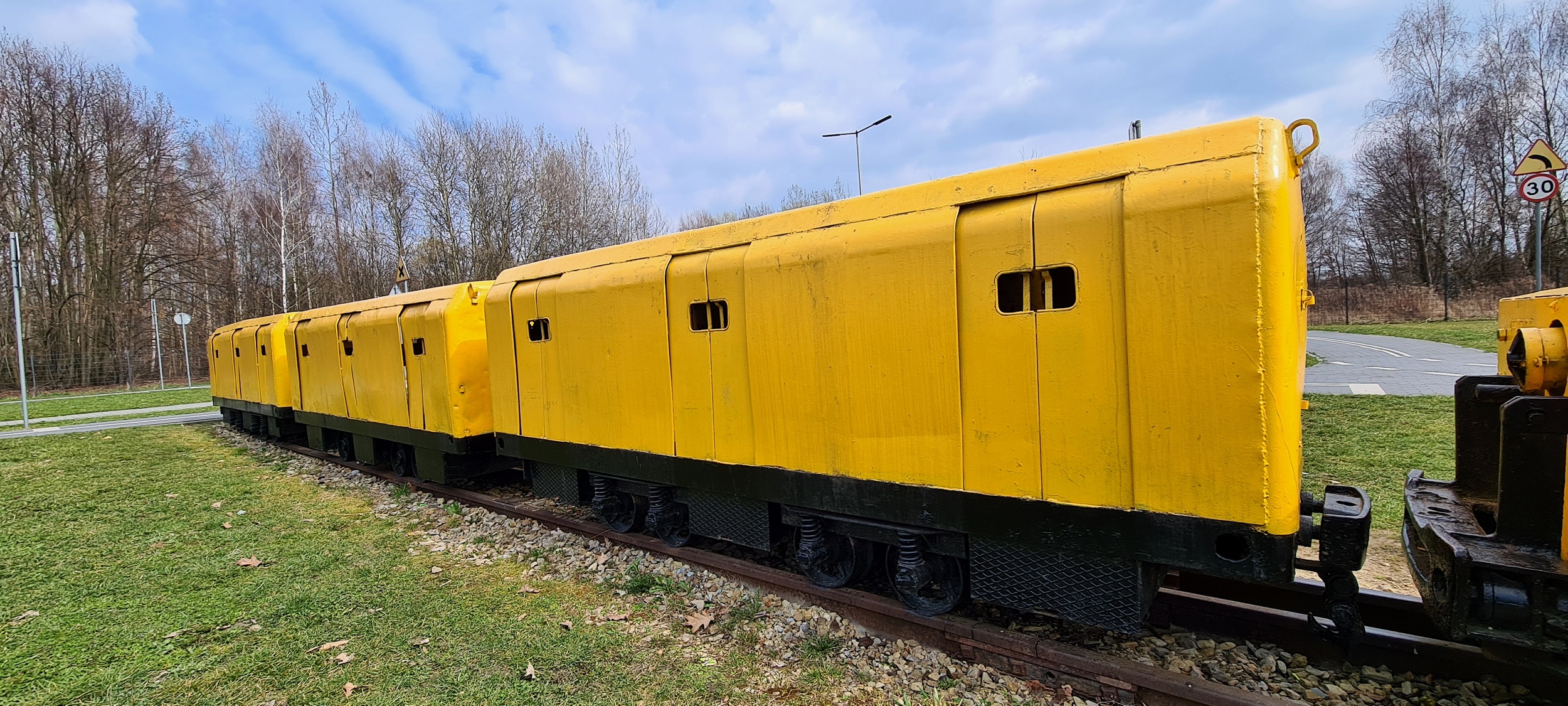 Skład trzech wozów kopalnianych do transportu pracowników, ustawiony na terenie miasteczka ruchu drogowego, przy ulicy Kolberga. Wagony pochodzą z KWK „Ruda”. (Ruda Śląska, 2026-03-24) |