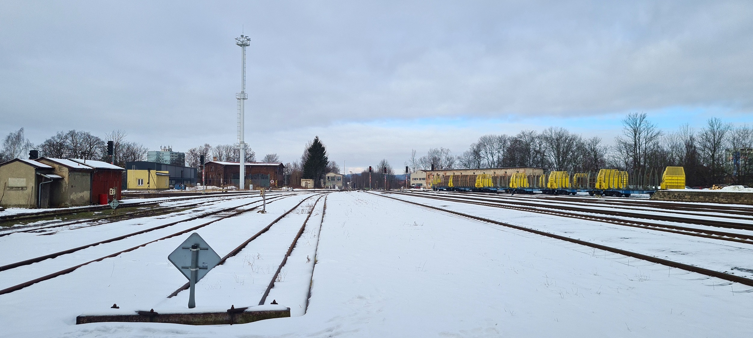 Widok na północną część stacji. W oddali, po lewej, za masztem oświetleniowym, widoczna dwustanowiskowa hala wachlarzowa. Po prawej ładownia, od lat obsługująca przeładunek drewna. (Liberec, 2026-02-04) |