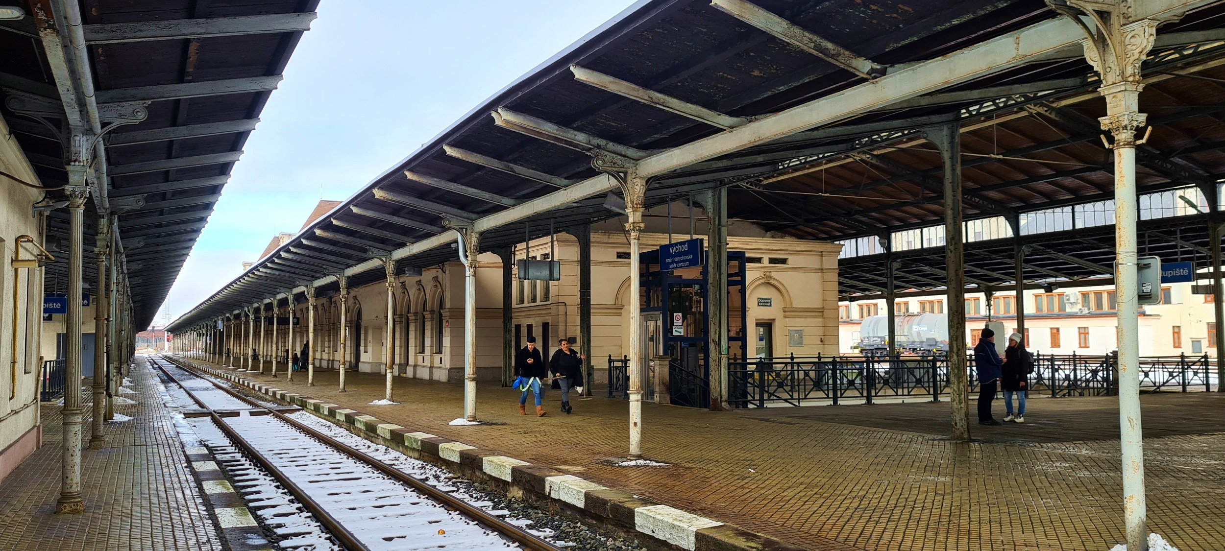 Widok na budynek dworca (na międzyperoniu) od strony peronu 4. Po prawej widoczne zejście do południowego tunelu pieszego. (Liberec, 2026-02-04) |