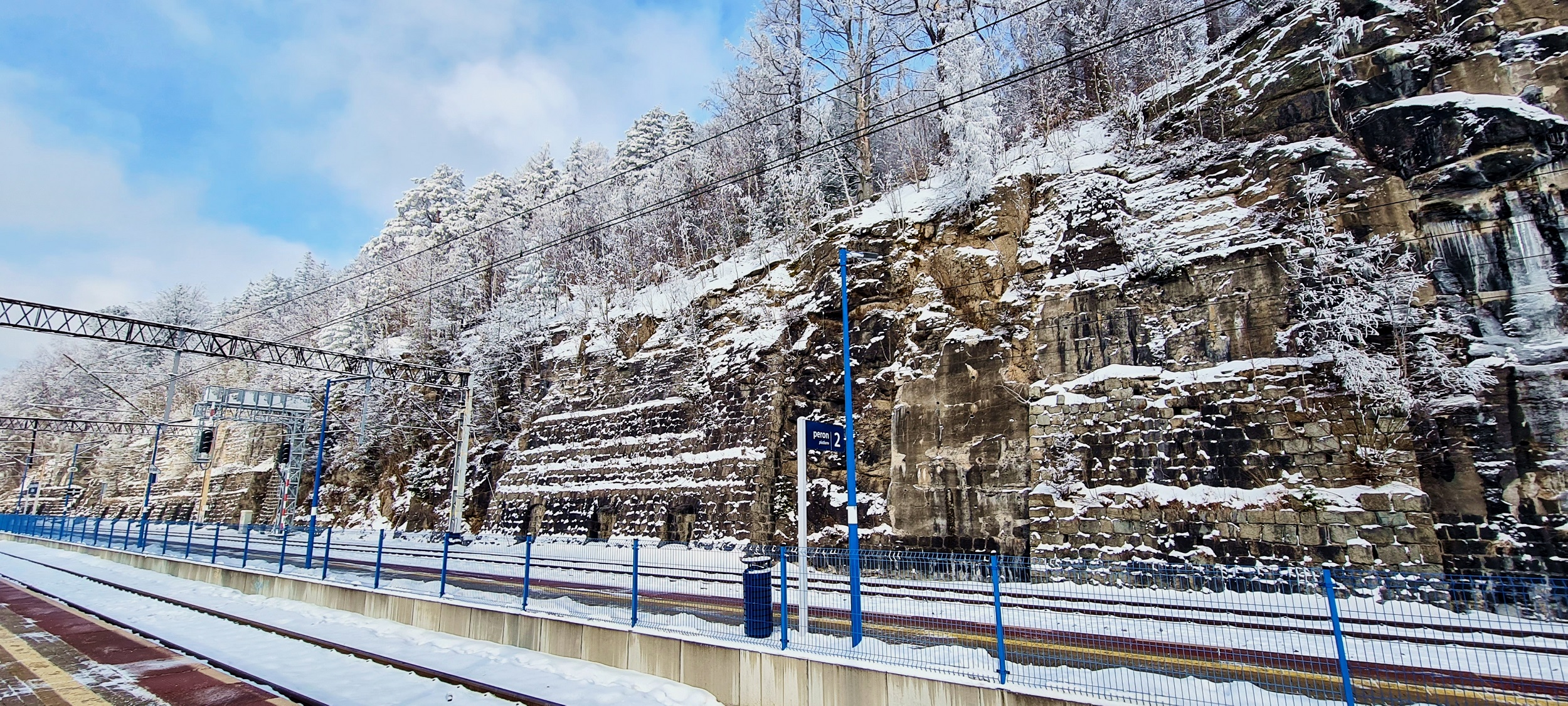 Komentarz: Widok z peronu 1 na górujący nad stacją mur oporowy. (Szklarska Poręba Górna, 2026-02-03)