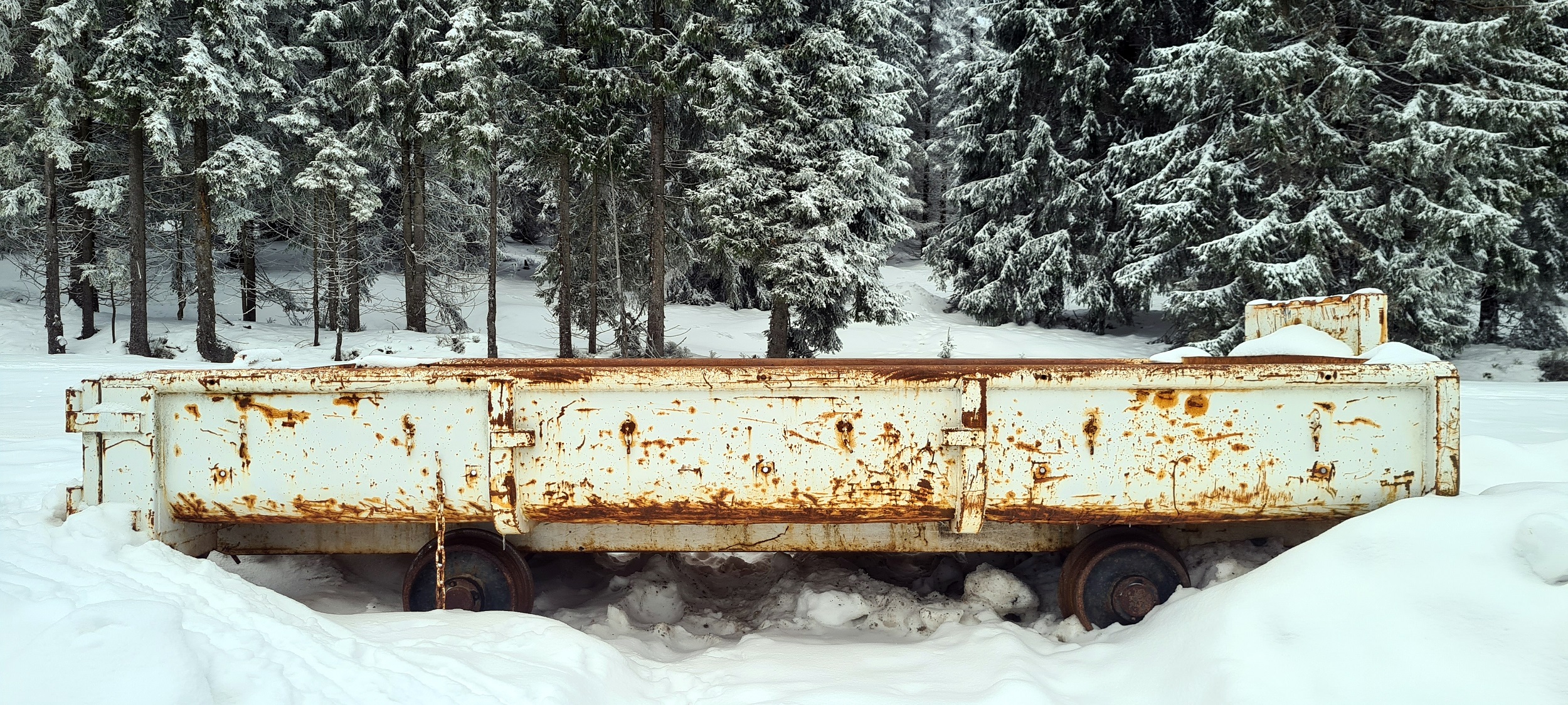 2-osiowy wózek, wepchnięty w zaspę w rejonie mijanki. Daort wie, skąd i po co. (Szklarska Poręba Jakuszyce, 2026-02-02) |