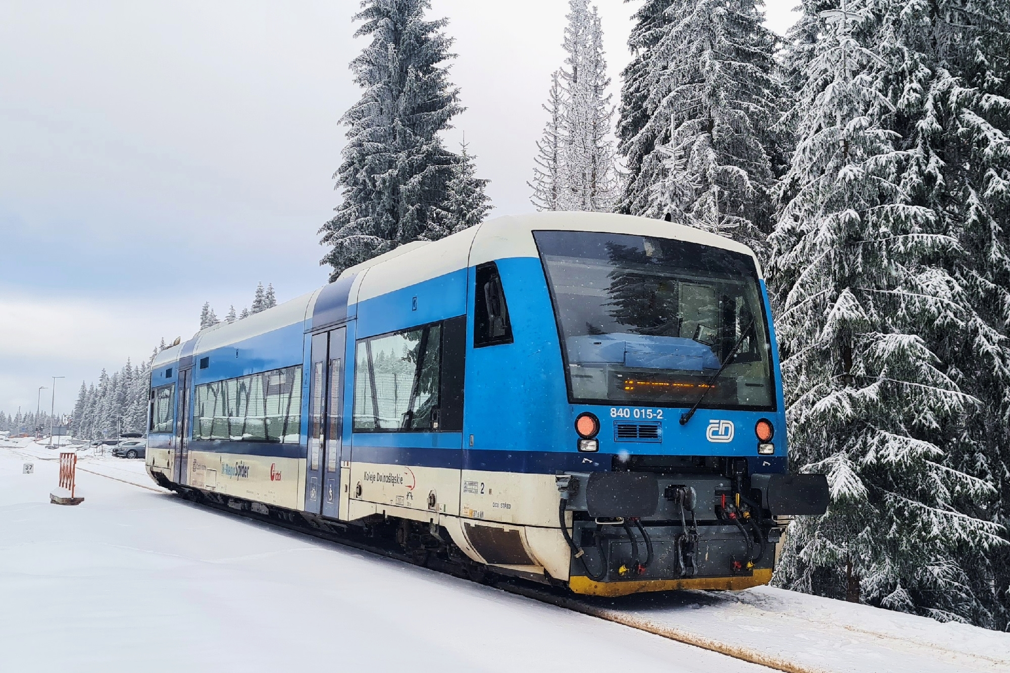 840 015-2 jako pociąg KD2662 z Liberca do Szklarskiej Poręby Górnej, kilkadziesiąt metrów przed peronem, od strony Harrachova. (Polana Jakuszycka, 2026-02-02) |