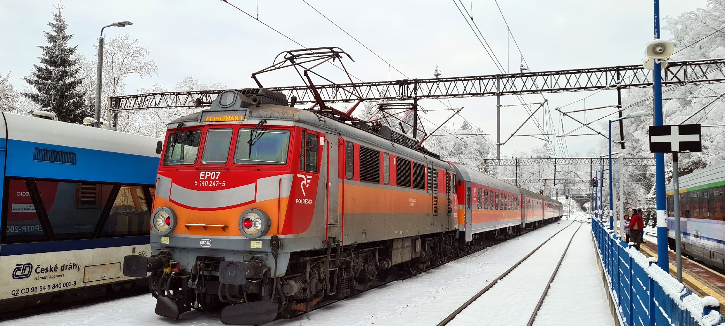 Do kompletu w kadrze widoczny jest wagon motorowy ČD, jako pociąg do Liberca i koniec składu PKP IC IC6150 „Śnieżka”, do Warszawy Wschodniej. Brakuje tylko jednostki KD, która za kilka minut wtoczy się na widoczny, wolny tor (choć za plecy fotografującego) i zestaw taboru wszystkich czterech przewoźników, docierających do Szklarskiej Poręby, byłby ujęty. (Szklarska Poręba Górna, 2026-02-01) |
