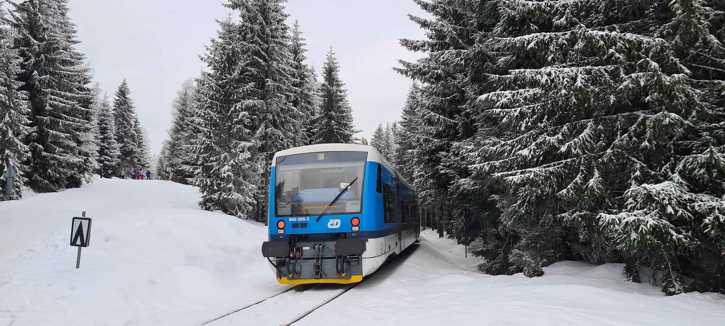 Wagon motorowy 840 005-3 w składzie z 840 006-1, jako pociąg KD2660 z Liberca do stacji Szklarska Poręba Górna, kilkaset metrów za przystankiem Szklarska Poręba Jakuszyce. (2026-02-01) |