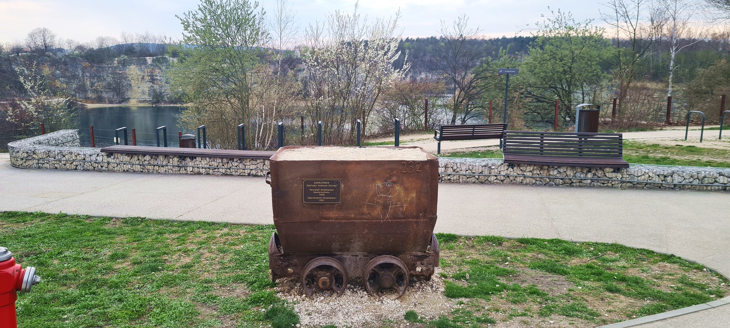 Mały wóz kopalniany ustawiony przy zejściu do byłego kamieniołomu Zakrzówek. (Kraków, 2026-04-04) |