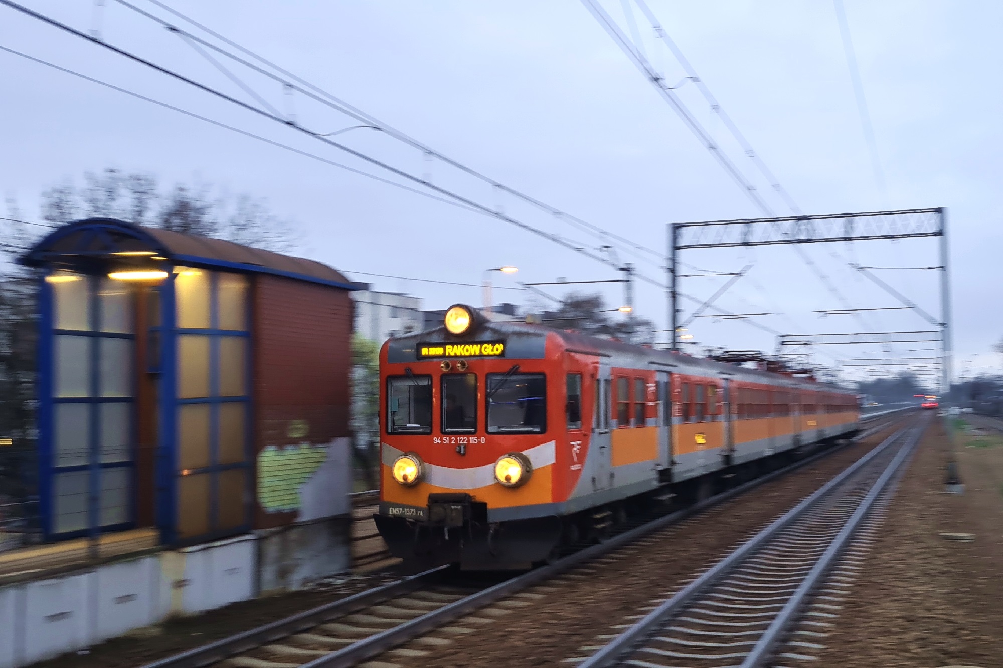 EN57-1373 jako pociąg R33139 K33 „Gwarek Olkuski”, relacji Wolbrom – Kraków Główny. (Kraków Łobzów, 2026-04-09) |