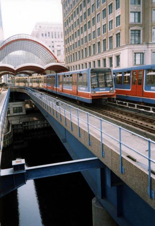 Składy kolejki DLR, jeżdżącej w sieci londyńskiego metra. W tle widoczna hala peronowa przystanku Kanary Harf. (London – West India Quay, sierpień 2003) |